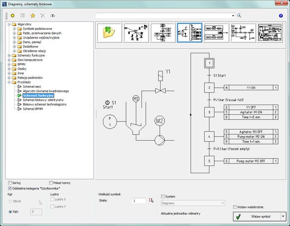 • функціональні діаграми (символи, наприклад, дія, початковий крок, порядок, з'єднання, розгалуження, таймер пульсації),